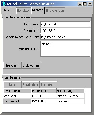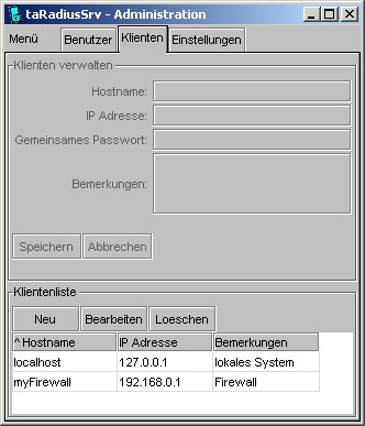 Klienten sind Computer Systeme, die den RADIUS Authentifizierungsservice benutzen dürfen. Benutzer sind Personen, welche den RADIUS Server verwenden können, um sich bei den Klienten anzumelden. Es gibt (zur Zeit) keine Gruppen. Deshalb können sich alle Benutzer bei allen Klienten anmelden, wenn die Authentifizierung korrekt ist.