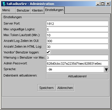 Mit 'Sprache' kann eine der verfügbaren Sprachen ausgewählt werden. Sie müssen den RADIUS Server neu starten, bevor diese Aenderung aktiv wird. Sie können selber weitere Sprachen hinzufügen. Beschaffen Sie sich hierzu das Sprachpaket (taRadiusSrv-custom.zip) und installieren Sie es wie hier beschrieben.