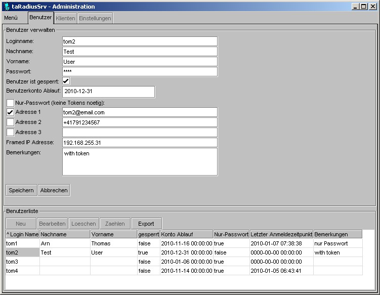 'Adresse 1', 'Adresse 2' und 'Adresse 3' können aktiv oder inaktiv sein und werden benutzt, um das Einmalpasswort dem Benutzer zu senden, indem das entsprechende Script (taRadiusSrv-SendTokenX.cmd) aufgerufen wird. Die Adressen können beliebig definiert werden, z.B. eine email-Adresse oder eine handy/pager Nummer. Wie genau diese Adressen verwendet werden, um dem Benutzer das Einmalpasswort zu senden, bleibt den Scripts überlassen.