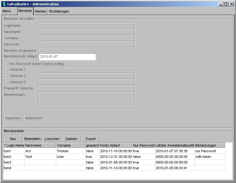 - 'Zaehlen' Knopf: zeigt die Anzahl Benutzer in der Datenbank und die Grösse der Lizenz an (= maximal mögliche
